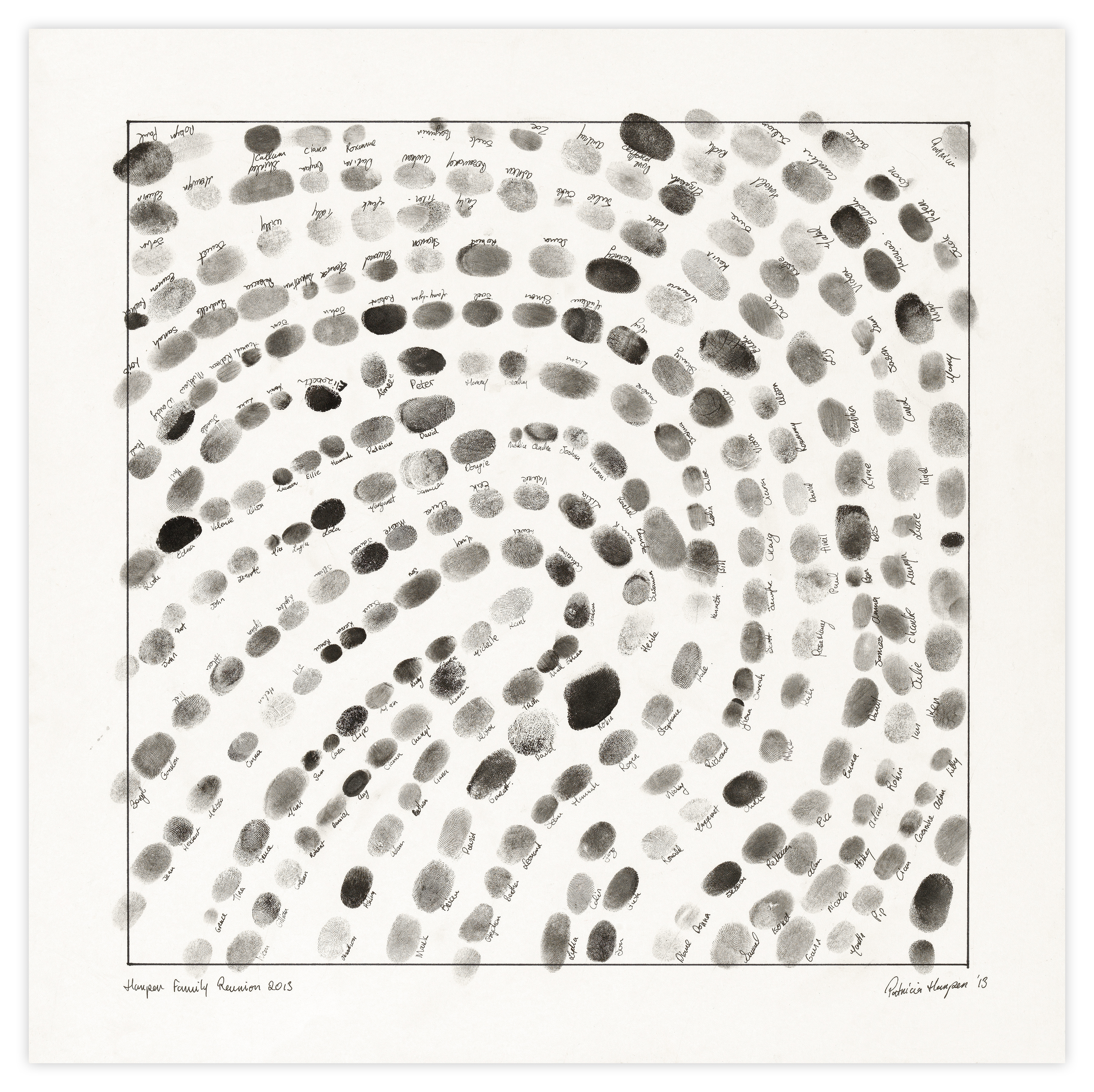 As an artist, I had the honour of collaborating on a unique art piece at The Harper reunion in April 2013. The project was inspired by the Harper family's Christian heritage, and the idea of unity through faith, love and commitment to one another. The art piece was created by collecting fingerprints from each family member and combining them into a cohesive design. Each fingerprint is unique and represents everyone’s individuality and personal history, and together they created a beautiful and meaningful work of art.