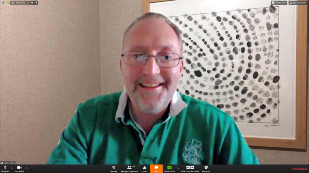 Over the weekend the events on Zoom were recorded for posterity by the hosts. The closing task fell on Alister Shaw to organise the whole group and capture them in multiple screen shots. Family members were called in from other rooms, Zoom names changed from iPhone/iPad to reflect the person’s name and finally the challenge of getting toddlers to sit still while this was all happening.
